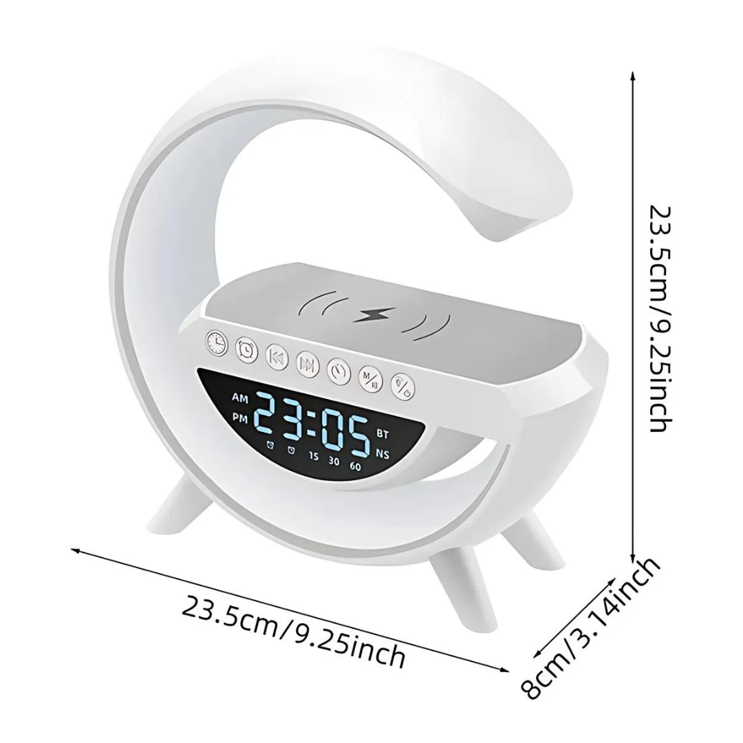 Lampa Smart LED RGB: O lumina smart cu marimea de: 9,25 inchi * 3,14 inchi * 9,25 inchi (23,5 cm * 8 cm * 23,5 cm), incarcator pentru telefon fara fir, difuzor 5W Bluetooth, lumina pentru somn, lumina de noptiera, ceas, ceas cu alarma, totul intr-unul. Puteti folosi aceasta lampa fantastica in timp ce lucrati, studiati, cititi si dormi.